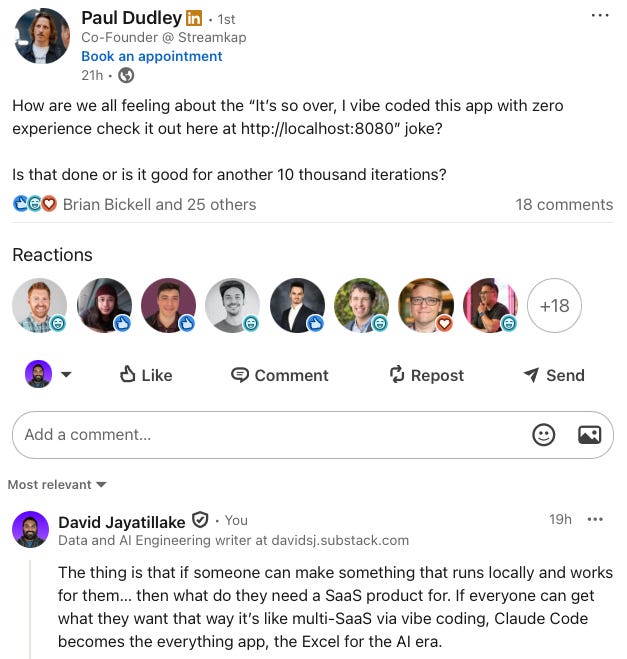 User-built software has none of this. It runs on your machine, so scalability is irrelevant… there’s one user. You already have access to the data, so security is just your existing boundary. Your laptop sits idle most of the day anyway, so efficiency barely matters. Documentation? You prompted it, so you understand it. All the boilerplate essentials that make SaaS saleable are unnecessary. The software doesn’t need to be good by any conventional standard. It just needs to work for you.2