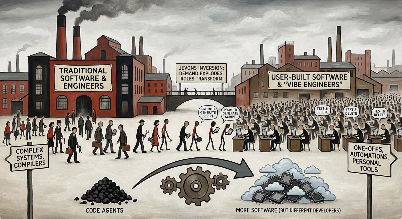 Jevons Paradox applies. The demand for software engineering explodes. The demand for software engineers, as we’ve known them, may not.